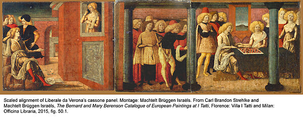 That now has to be seen next to the ›other Liberale in the house‹, a cassone fragment (some ›onlookers‹), whose ›companion pieces‹ (the beautiful lady, about to lose a game of chess, and some other, male and female onlookers, gathered as partizans on the left and on the right; see large picture above and small picture on the right; and a scene apparently showing the ›eye contact‹ of two young lovers; see the virtual reconstruction of all three scenes here) are now in the Metroplitan Museum of Art. For everyone wanting to know more details, photos of this or other Liberale ›in the house‹, especially the roundels that we don’t give here, and a full survey of dispersed works and informations, we recommend to look into Vinco’s catalogue monograph that focusses on the especially rich cassone heritage of Verona and is the result of many years of laborious work ›in the tracks‹ of the pioneers of cassone connoisseurship (Paul Schubring and others).